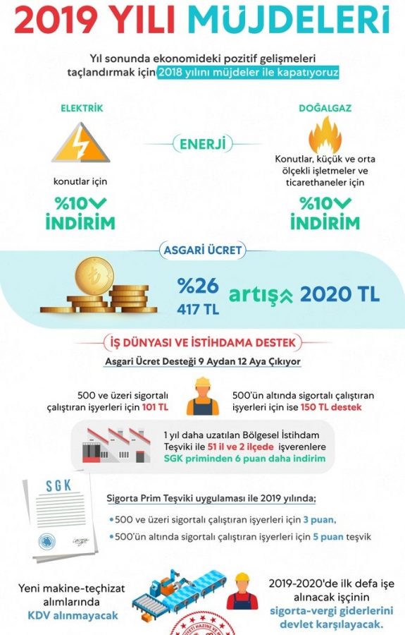 2019 yılı için asgari ücretin yüzde 26 artışla 2 bin 20 TL’ye yükseltildiği gün, Cumhurbaşkanı Recep Tayyip Erdoğan’dan vatandaşa elektrik ve doğalgazda indirim, iş dünyasına istihdam teşviklerine devam müjdesi geldi. Asgari ücretteki artışı olumlu karşılayan iş dünyası temsilcileri, asgari ücret prim desteğinin yeniden düzenlenmesini istiyor.